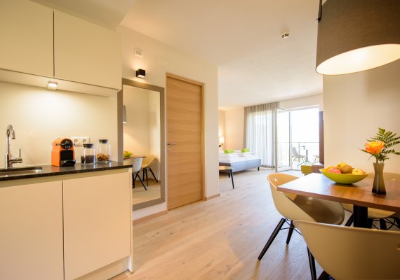 Das Studio "Gartenblick", ca. 37m² groß, nach Osten ausgerichtet, ist eine helle, wohnliche Ein-Raum-Suite für 2 bis 3 Personen, mit Küchenzeile, Balkon oder Terrasse und schönem Ausblick Richtung Garten und Außenpool.